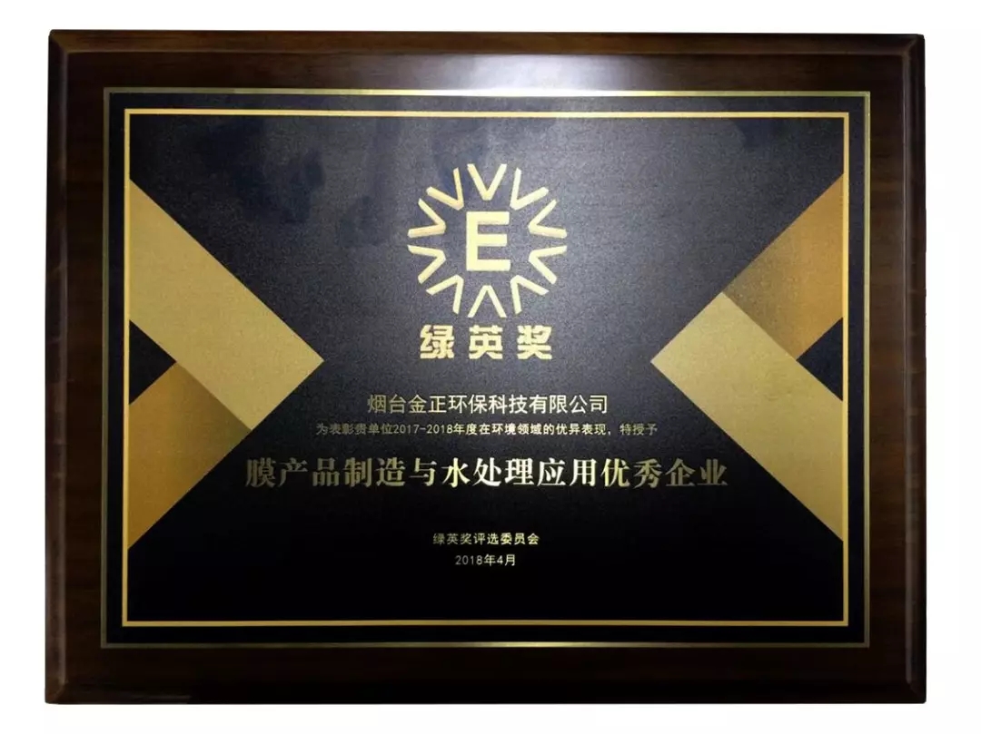 煙臺金正環保科技有限公司于2018年4月20日,榮獲2017-2018年度“綠英獎-膜產品制造與水處理應用優秀企業榮譽”稱號。
