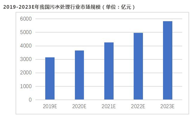 受?chē)?guó)家政策支持、各方資本涌入、技術(shù)工藝革新等因素驅(qū)動(dòng),我國(guó)污水處理行業(yè)將持續(xù)快速發(fā)展,預(yù)計(jì)到2023年,我國(guó)污水處理行業(yè)市場(chǎng)規(guī)模將達(dá)到5820億元,2019-2023年復(fù)合增長(zhǎng)率達(dá)14.7%。